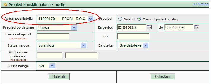 | Kada je knjigovodstveni servis prijavljen za rad po računu svog klijenta, u transakciji "Pregled naloga " u polju "Račun pošiljatelja" automatizmom se poziva prijavljeni račun klijenta knjigovodstvenog servisa. (slika dole) | |