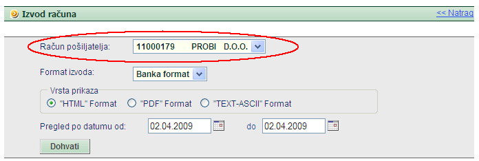 | Kada je knjigovodstveni servis prijavljen za rad po računu svog klijenta, u transakciji "Izvodi računa" u polju "Račun pošiljatelja" automatizmom se poziva prijavljeni račun klijenta knjigovodstvenog servisa. (slika dole) | |