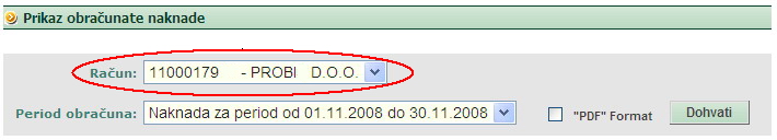 | Kada je knjigovodstveni servis prijavljen za rad po računu svog klijenta, u transakciji "Pregled obračunate naknade" u polju "Račun" automatizmom je upisan prijavljeni račun klijenta knjigovodstvenog servisa. (slika dole) | |