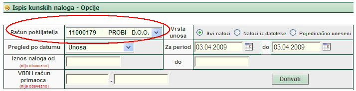 | Kada je knjigovodstveni servis prijavljen za rad po računu svog klijenta u transakciji "Ispis naloga " u polju "Račun pošiljatelja" automatizmom je upisan prijavljeni račun klijenta knjigovodstvenog servisa. (slika dole) | |