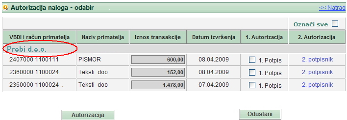 dole) Napomena: Na primjeru zaslona autorizacije vidi se opcija kada je online aplikacija parametrizirana za obavezne dvije autorizacije prije slanja naloga na izvršenje. Nakon autorizacije naloga (u ovom slučaju dvije autorizacije), naloge je potrebno poslati na izvršenje koristeći pri tomu transakciju "Slanje naloga na izvršenje" u desnom okviru zaslona. |