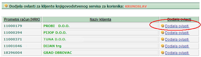 | Nakon odabira opcije "Dodjela ovlasti - klijent KS-a" za željenog djelatnika knjigovodstvenog servisa (dodatna kartica sa nižim ovlastima - slave), na zaslonu se prikazuje popis klijenata knjigovodstvenog servisa. | |