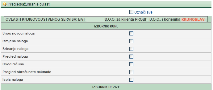 | Odabirom opcije "Dodjela ovlasti" na zaslonu se prikazuje popis svih mogućih transakcija za koje glavna kartica knjigovodstvenog servisa ovlašćuje za rad dodatnu karticu knjigovodstvenog servisa, a po računu željenog klijenta knjigovodstvenog servisa. (slika dole) | |