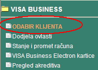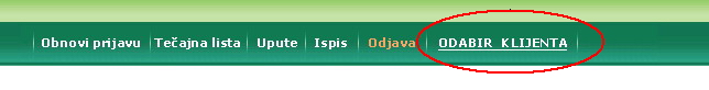 Da bi knjigovodstveni servis mogao raditi transakcije po računu vlastitog klijenta, potrebno je izvršiti online rekonfiguraciju, tj. prijavu za rad po računima klijenta. Nakon klasične prijave za rad u eLEMENT@ internet bankarstvo, za prijavu za rad po računima klijenta knjigovodstvenog servisa koristi se transakcija "Odabir klijenta" u lijevom djelu zaslona (slika dole) |