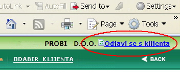Prijava za rad po računu klijenta knjigovodstvenog servisa reflektira se na sadržaj u gornjem desnom dijelu zaslona, kako bi korisnik u svakom momentu mogao vidjeti naziv klijenta po čijim računima trenutno radi. Opcija "Odjavi se s klijenta" omogućava direktan povrat za rad po osnovnim računima knjigovodstvenog servisa. (slika dole) Napomena: Korištenjem opcija "Račun primatelja (HRK)", "Naziv klijenta" i "Označi za unos", može se napraviti sortiranje liste klijenata prema navedenim kriterijima, tj. prema broju računa, nazivu klijenta ili trenutnom statusu Prijavljen / Prijava. |