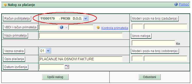 | Kada je knjigovodstveni servis prijavljen za rad po računu svog klijenta u transakciji "Unos novog naloga" u polju "Račun pošiljatelja" automatizmom se poziva broj prijavljenog računa klijenta sa kojeg se vrši plaćanje. (slika dole) | |