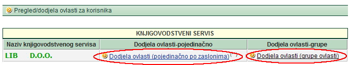 | Transakcija "Dodjela ovlasti" korisniku usluge knjigovodstvenog servisa omogućava dodjelu i oduzimanje ovlasti. nakon poziva transakcije "Dodjela ovlasti" na zaslonu se prikazuje slijedeće: | |
