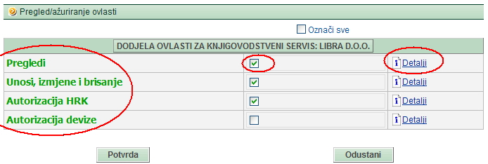 Na primjeru zaslona (slika gore) vidljive su četiri grupe transakcija. Popis sadržaja svake grupe moguće je pozvati opcijom "Detalji". Grupa transakcija za koju se želi dati ovlast knjigovodstvenom servisu označava se stavljanjem kvačice u "checkbox". Transakcija je potrebno autorizirati. Date ovlasti reflektiraju se na sve pod račune (11, 13, 14, 15, 18) Važno: Dodjelom pojedinačnih ovlasti za korisnika poništavaju se ovlasti zadane za grupu ovlasti i obratno. Ovlasti koje dodjeljuje poslovni subjekt svom knjigovodstvenom servisu pridružuju se samo glavnoj (master) kartici ili glavnom tokenu knjigovodstvenog servisa. Daljnji prijenos ovih ovlasti na dodatne smart kartice ili dodatne tokene unutar knjigovodstvenog servisa vrši glavna kartica ili glavni token tog knjigovodstvenog servisa. |