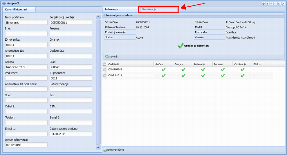 Nakon ulaska u zaslon obnove certifikata, prvo se prikazuje stanje trenutno instaliranih certifikata na kartici. Ukoliko se certifikat obnavlja prije samog isteka, na zaslonu će biti prikazane sve zelene kvačice kako je to prikazano na slici iznad. Odaberite opciju "Reizdavanje" (strelicom označeno na slici iznad). Važna napomena: Ukoliko se postupku obnove certifikata pristupa nakon istekaka istih, korisnik će automatizmom biti prebačen u sljedeći zaslon (Reizdavanje) kako je to prikazano na slici ispod. |