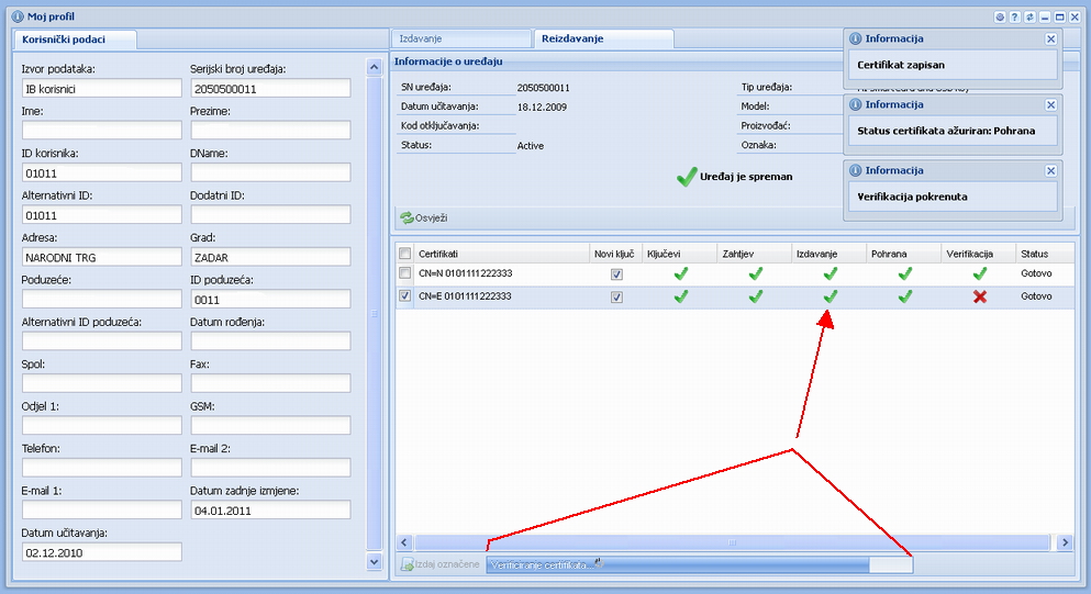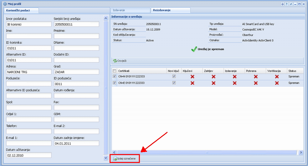 | Za pokretanje postupka obnove certifikata odaberite opciju "Izdaj označene". Vidi sliku iznad - označeno crvenom strelicom. | ||