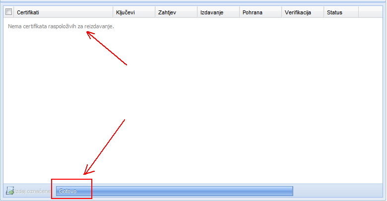 | Postupak obnove certifikata traje određeno vrijeme. Progresija obnove certifikata može se pratiti kroz tijek "Verifikacije certifikata" (slika iznad). U procesu obnove certifikata crvene"X" oznake se slijedno mijenjaju u zelene kvačice. Nakon što se obnove svi elementi certifikata (ključevi, zahtjev, izdavanje, pohrana, verifikacija) na zaslonu će se pojaviti natpis "Gotovo", a na mjestu gdje su bili prikazani certifikati ispisati će se poruka "Nema certifikata raspoloživih za reizdavanje". (vidi sliku ispod) | ||
