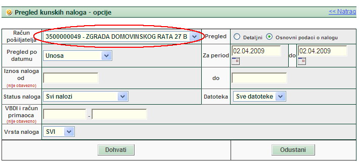 Kada je stanoupravitelj prijavljen kao SZP račun, u transakciji "Pregled naloga " u polju "Račun pošiljatelja" automatizmom je upisan prijavljeni SZP račun. (slika dole)