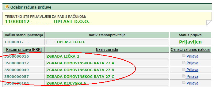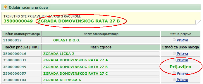Napomena: Korištenjem opcija "Račun primatelja (HRK)", "Naziv zgrade" i "Status prijave", može se napraviti sortiranje liste prema navedenim kriterijima, tj. prema broju računa, nazivu zgrade ili trenutnom statusu Prijavljen / Prijava. Nakon odabira SZP računa opcijom "Prijava" u stupcu "Označi za unos naloga" na zaslonu se u polju "Trenutno ste prijavljeni za rad sa računom" vidi broj računa i naziv odabranog SZP računa. U stupcu "Označi za unos naloga" (slika dole) opcija "prijava" se mijenja u "Prijavljen". (slika dole)