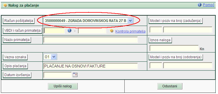 Kada je stanoupravitelj prijavljen kao SZP račun, u transakciji "Unos novog naloga" u polju "Račun pošiljatelja" automatizmom se poziva broj SZP računa s kojeg se vrši plaćanje. (slika dole)