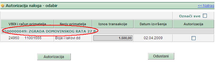 Na primjeru zaslona autorizacije vidi se opcija kada je online aplikacija parametrizirana za samo jednu autorizaciju prije slanja naloga na izvršenje. Nakon autorizacije, naloge je potrebno poslati na izvršenje koristeći pri tomu transakciju "Slanje naloga na izvršenje" u desnom okviru zaslona. |
