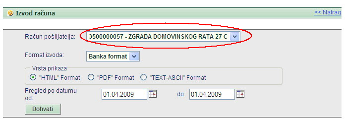 Kada je stanoupravitelj prijavljen kao SZP račun, u transakciji "Izvodi računa" u polju "Račun pošiljatelja" automatizmom se poziva prijavljeni SZP račun. (slika dole) Napomena: Kada stanoupravitelj nije prijavljen kao SZP račun, korištenjem padajućeg izbornika mogu se također pozvati izvodi za sve SZP račune.