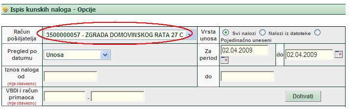 Kada je stanoupravitelj prijavljen kao SZP račun, u transakciji "Ispis naloga " u polju "Račun pošiljatelja" automatizmom je upisan prijavljeni SZP račun. (slika dole)