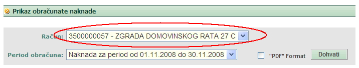 Kada je stanoupravitelj prijavljen kao SZP račun, u transakciji "Pregled obračunate naknade" u polju "Račun" automatizmom je upisan prijavljeni SZP račun. (slika dole)