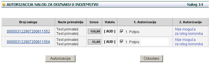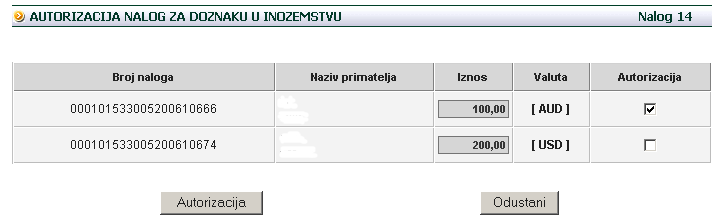 Autorizacija naloga 14 Nakon što je nalog 14 unesen, potrebno je izvršiti autorizaciju. Autorizacija naloga vrši se digitalnim potpisom (unos PIN-a). Autorizaciju je moguće napraviti za jedan ili više unesenih naloga 14. U polju "Autorizacija" označite naloge koje želite autorizirati. Transakcijom autorizacije naloga 14 iste ste poslali na izvršenje.