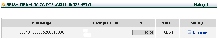 Brisanje naloga 14 Transakcija omogućava brisanje naloga 14. Za nalog 14 koji želite brisati, izaberite opciju "brisanje".