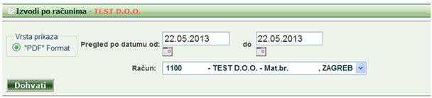 | Odaberete period i račun (uključuje povezane račune) za koje želite izvod te dohvat. Izvod se prikazuje po transakcijskim računima i računima naknada te računima koji se koriste pri transakcijama s inozemstvom u PDF formatu. | ||