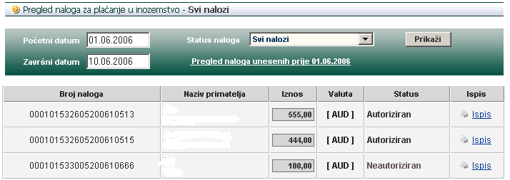 Napomena: za naloge 14 zadane prije 01.06.2006. godine, pregled i ispis istih je moguće napraviti pozivom opcije: "Pregled naloga unesenih prije 01.06.2006." |