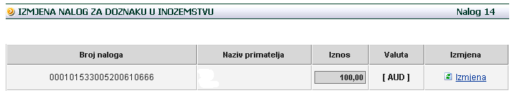 Izmjena naloga 14 Transakcija izmjene naloga 14 omogućuje izmjenu svih unesenih polja. Za nalog 14 kojeg želite izmjenti izaberite opciju "izmjena".