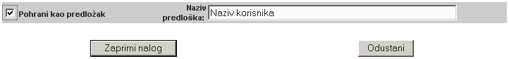 Nakon što ste odabrali opciju "pohrani kao predložak", na zaslonu će se pojaviti novo unosno polje pod nazivom "naziv predloška" (slika 2). Polje se automatizmom popunjava sa nazivom korisnika iz naloga 14 (polje 8). Naziv predloška je moguće izmjeniti prema želji. Opcijom "Zaprimi nalog" potvrdite unos naloga 14. Slika 2: