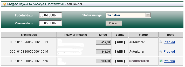 Pregled najava plaćanja (nalog 14) Transakcija pregleda naloga 14 omogućava pregled svih naloga zadanih u jednom danu ili željenom periodu. Transakcija omogućava pregled svih naloga bez obzira na status ili prema statusima: neautoriziran, autoriziran, proveden, odbijen, brisan.