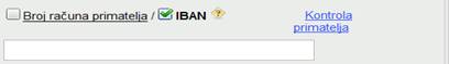 | Broj računa primatelja / IBAN | 10 / 21 | • Polje omogućava unos IBAN-a. IBAN je kratica za International Bank Account Number, (hrv. Međunarodni broj bankovnog računa), a radi se o međunarodnom standardu za numeraciju bankovnih računa. Pretvorba unosnog polja računa za unos broja računa u IBAN formatu može se napraviti stavljanjem kvačice u polje ispred natpis IBAN Struktura hrvatskog IBAN-a (HRxxxxxxxxxxxxxxxxxxxxx); 21 znak