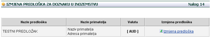 | Na zaslonu računala prikazati će se kompletan predložak naloga 14 kojeg želite potpuno ili djelimično izmjeniti. Izmjenite željena polja, te opcijom "izmjeni predložak" neposredno ispod naloga 14, potvrdite izmjene. | |