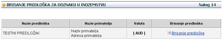 | Na zaslonu računala prikazati će se kompletan predložak naloga 14 kojeg želite brisati.. Neposredno ispod prikazanog predloška naloga 14, nalazi se opcija "brisanje predloška". Odabirom ove opcije predložak će biti brisan. | |