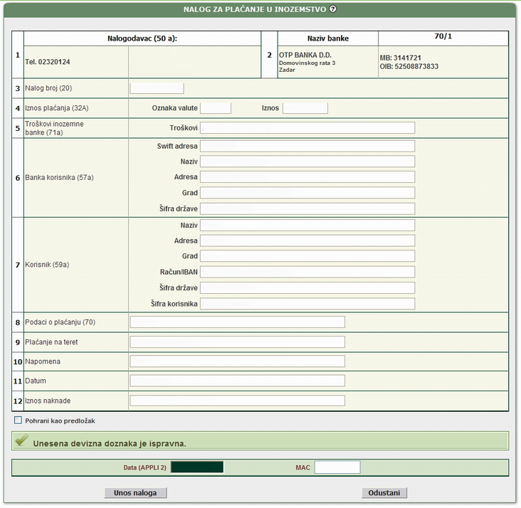 | Transakcija provjere naloga vrši automatsku kontrolu unesenih polja. Ukoliko su sva polja ispravno unesena, na zaslonu korisnika pojavljuje se obrazac deviznog platnog naloga sa svim potrebnim elementima (Slika 03). U ovom zaslonu uneseni podaci se ne mogu mijenjati. Unos platnog naloga potrebno je autorizirati. Autorizacija se vrši kroz zaslon provjere naloga izračunom MAC-a na tokenu (Appli 2). Ukoliko se devizni platni nalog želi sačuvati kao predložak za unos istog naloga u budućnosti, kvačicom je potrebno označiti polje ispred natpisa "Pohrani kao predložak" | |||