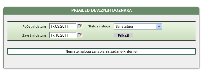 | U zaslonu pregleda naloga potrebno je unijeti početni i završni datum perioda za koji se vrši pregled, te odabrati status naloga kao dodatan filter. Ponuđeni statusi naloga u padajućem izborniku su: Svi statusi, Proveden, Odbijen, Zaprimljen, Zaprimljen na izvršenje | |||