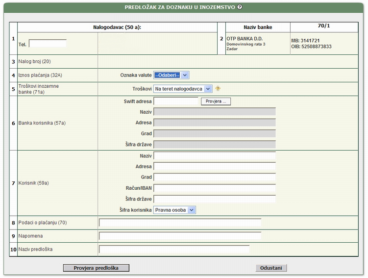 | 02 Naziv banke | Automatizmom se upisuje naziv OTP banke sa ostalim potrebnim podacima | ||