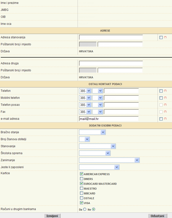 | Ime i prezime | Nije unosno polje, podatke nije moguće izmijeniti putem internet bankarstva. | ||