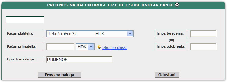 | Transakcija omogućava prijenos na račun druge fizičke osobe unutar banke. | |||